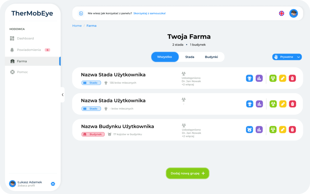 Moduły dla budynków trzody i stad bydła, z opcją edycji, historii i zarządzania.